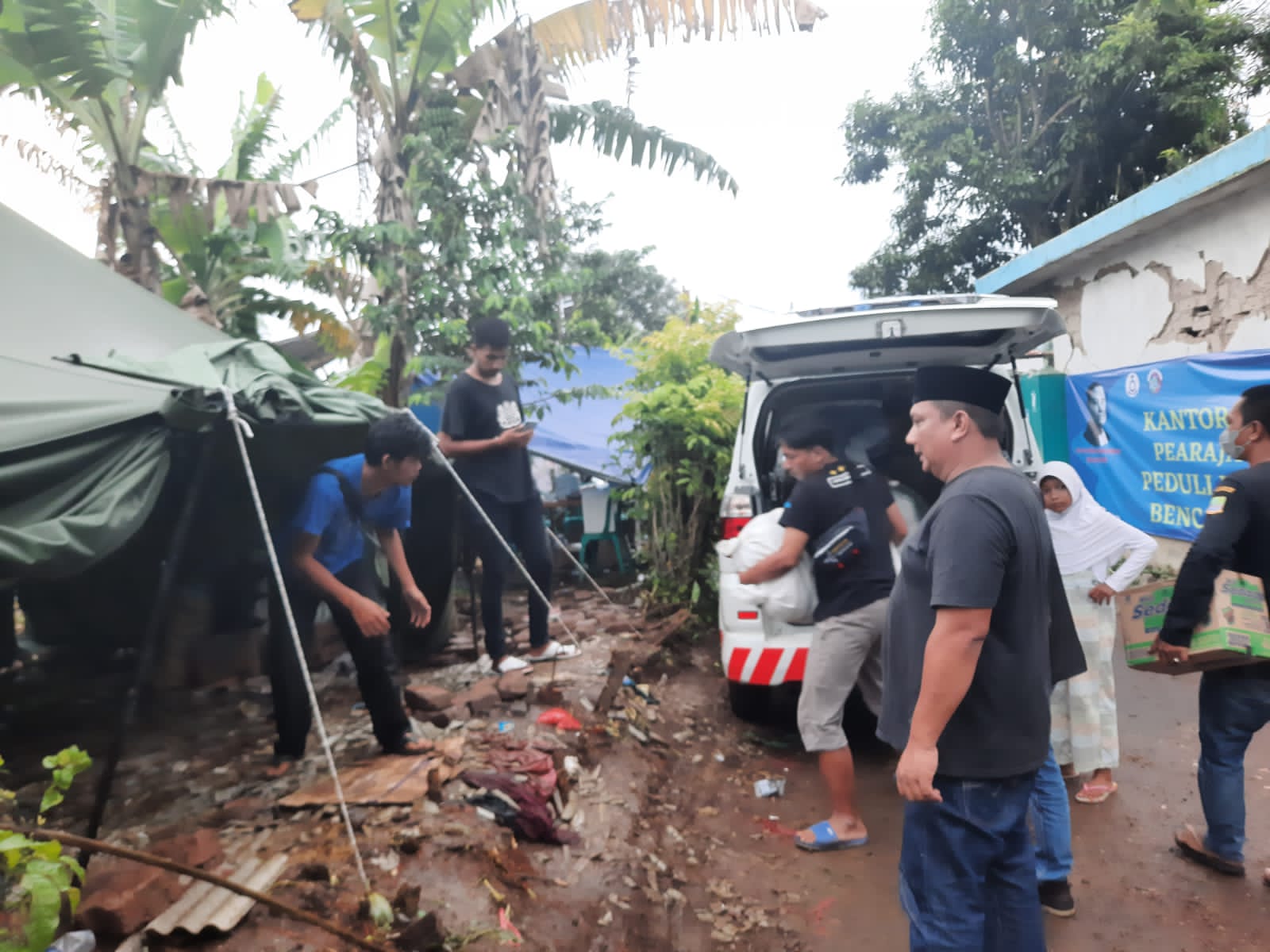 Cianjur – Gunakan Mobil Ambulan, Kepala Desa (Kades) Cipayung, Kecamatan Cikarang Timur, Kabupaten Bekasi, turun langsung ke tenda pengungsian bantu warga yang rumahnya ambruk dan rusak berat akibat gempa bumi.