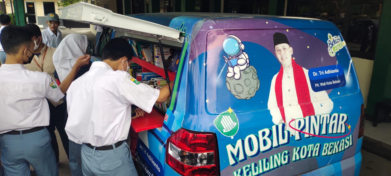 Kota Bekasi – Perpustakaan Keliling melalui mobil yang di tempatkan pada sekolah sekolah saat kunjungan Pelaksana Tugas (Plt.) Wali Kota Bekasi, Tri Adhianto untuk menjelaskan mengenai wawasan kebangsaan di tiap tiap kunjungan sekolah.