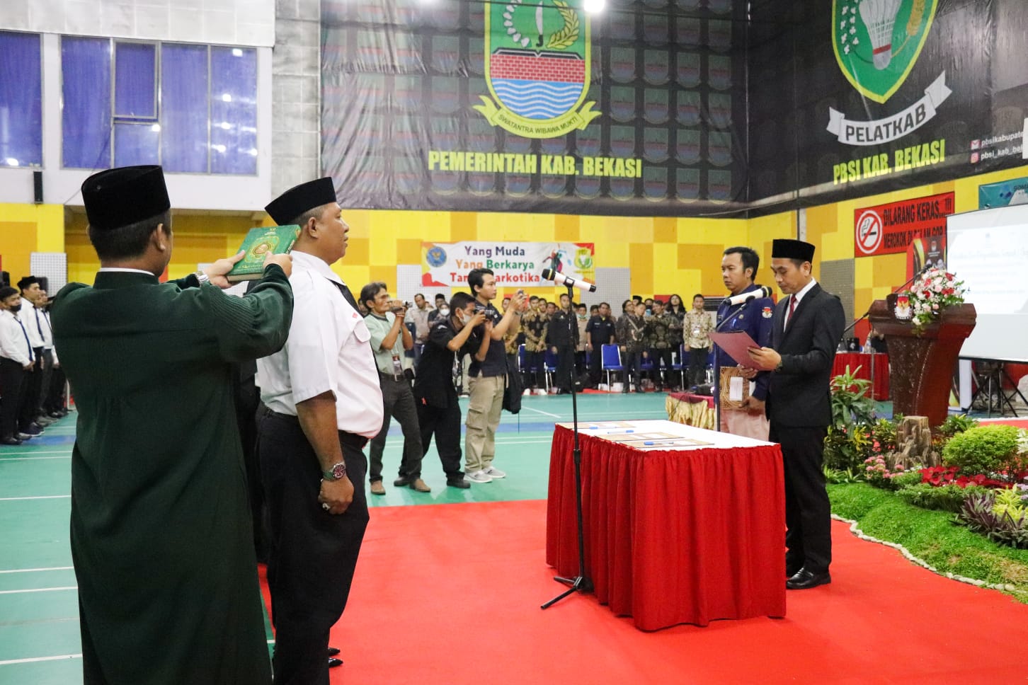 Kabupaten Bekasi – Penjabat Bupati Bekasi Dani Ramdan menghadiri pelantikan dan pengambilan janji sumpah 561 anggota Panitia Pemungutan Suara (PPS) untuk Pemilu Serentak tahun 2024, di Gedung Serbaguna Komplek Stadion Wibawa Mukti, Cikarang Timur, pada Selasa (24/01/2023).