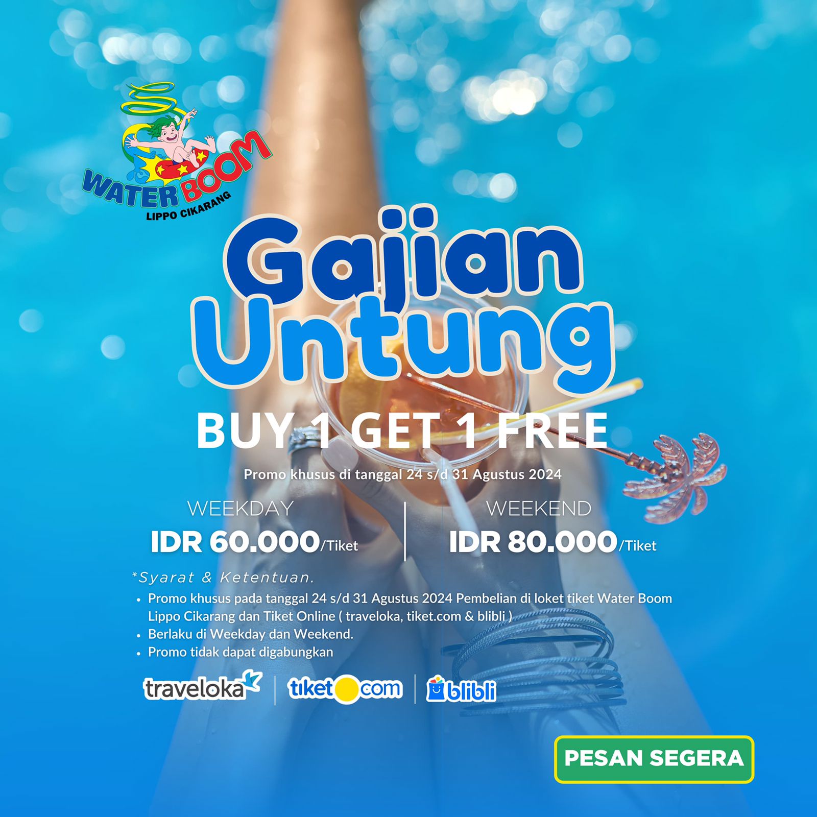 Dengan harga tiket promo yang sangat terjangkau, para pengunjung dapat menikmati pengalaman rekreasi air yang menyenangkan di Weekdays dengan harga Rp 60.000 dan Weekend dengan harga Rp 80.000. Promo ini berlaku untuk semua kategori usia, sehingga seluruh anggota keluarga bisa merasakan keceriaan tanpa harus khawatir dengan biaya yang tinggi.