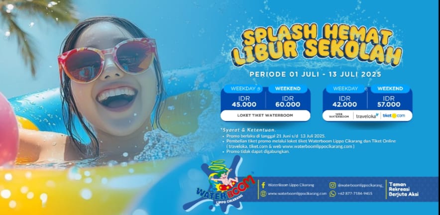 Kabupaten Bekasi – Menyambut liburan sekolah tahun ini, WaterBoom Lippo Cikarang kembali menghadirkan promo spesial bertajuk “Splash Hemat Libur Sekolah” yang berlaku mulai 1 hingga 13 Juli 2025.