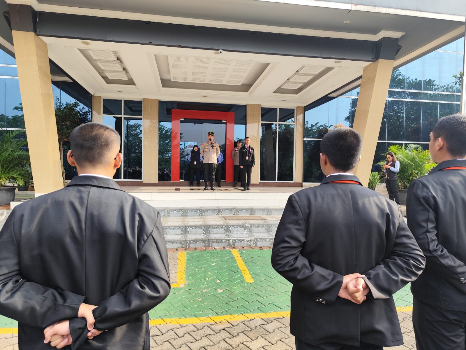Kapolsek Cikarang Pusat, AKP Elia Umboh, SH, MH, memberikan arahan kepada siswa-siswi SMK Ananda Mitra Industri Deltamas tentang pentingnya memiliki integritas, dedikasi, dan loyalitas.